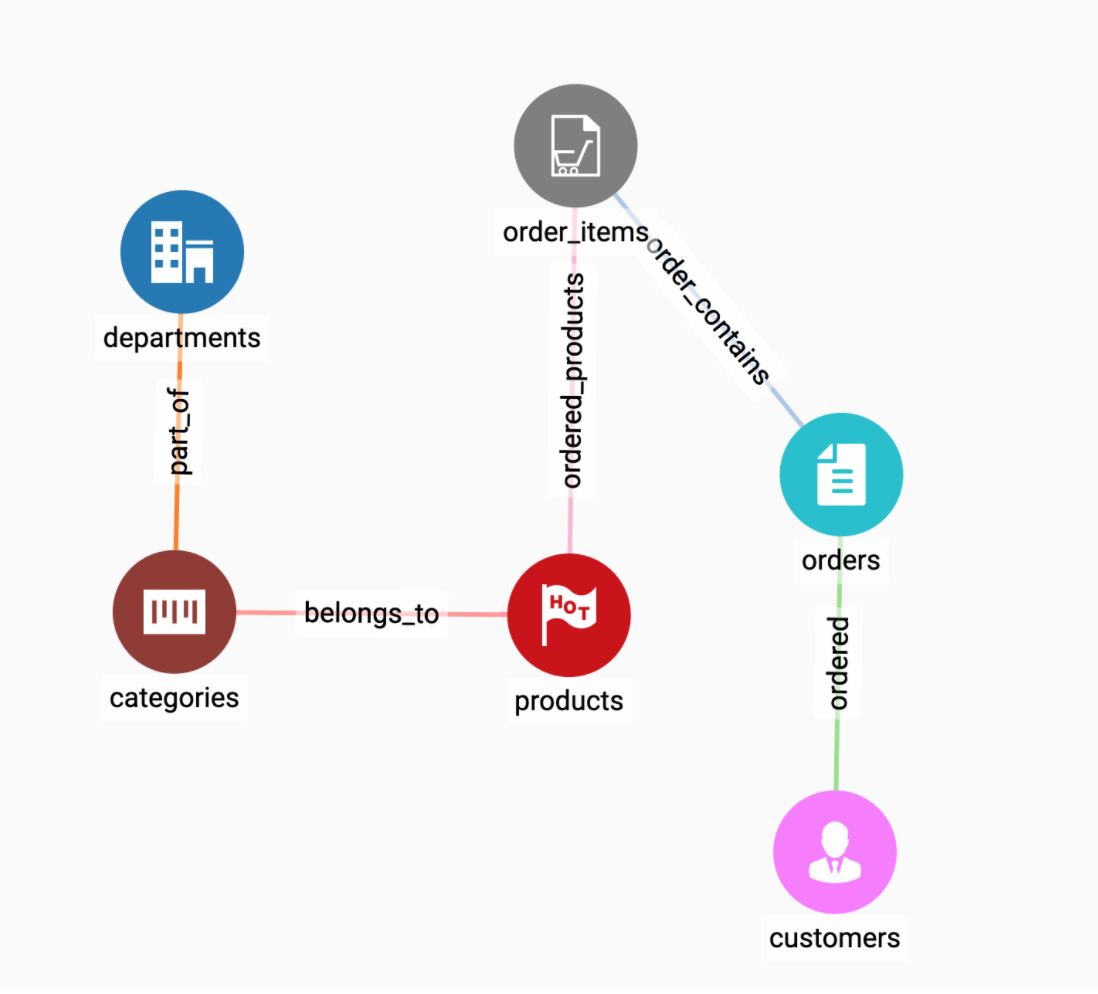 Once the data is ingested and queried for validation, we can build the same schema as represented in a graph database. We represent each table as a Vertex, columns as attributes, and the table joins represented as edges. This may not be the optimal schema for the use case, but is a good starting point.